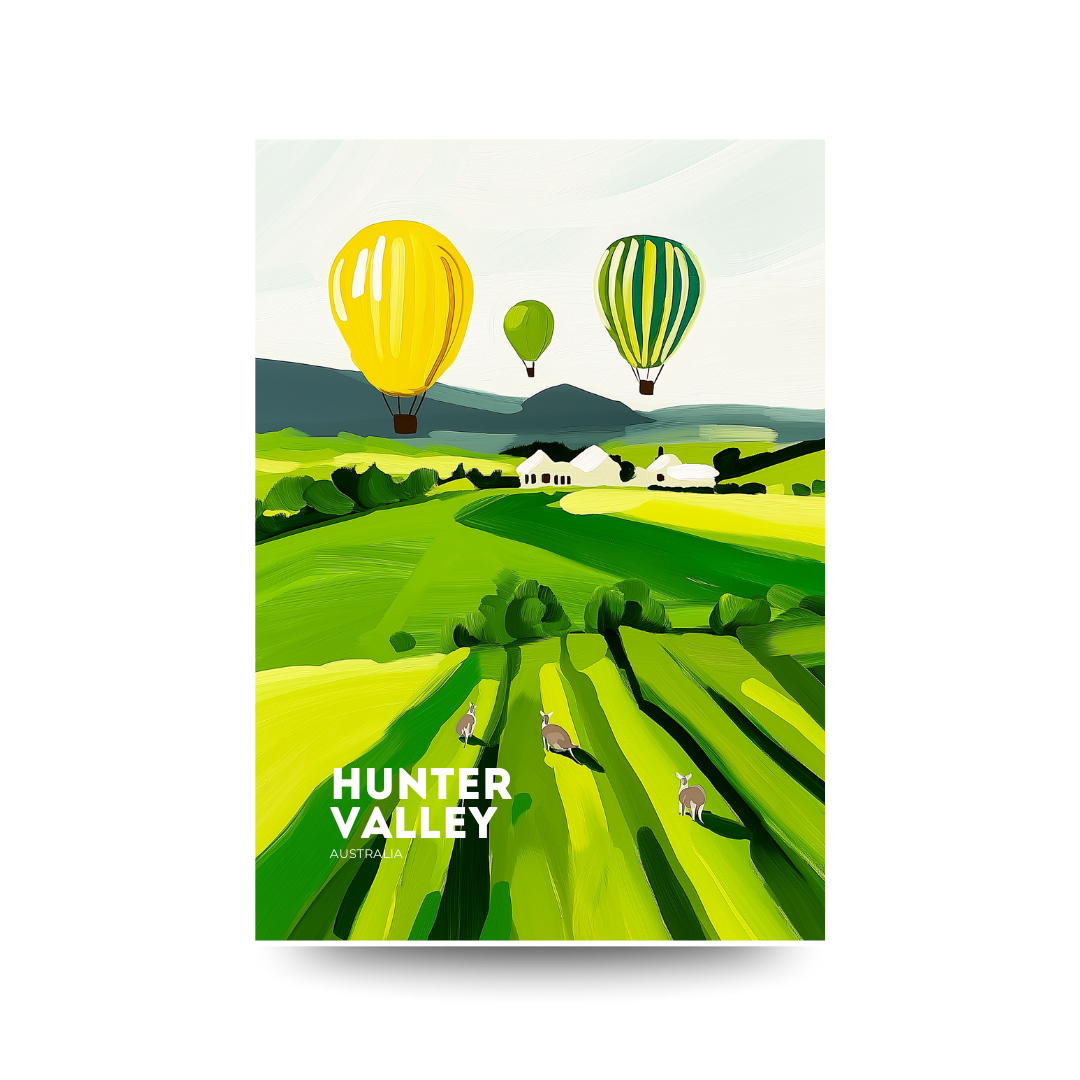 Float above one of Australia’s most iconic wine regions with our Balloons Over Vines A3 poster. This fresh and whimsical design captures a sunrise flight over emerald vineyards, golden pastures, and curious kangaroos, all painted in bold, joyful brushstrokes. A trio of hot air balloons drifts serenely above the Hunter Valley, evoking freedom, serenity and adventure.