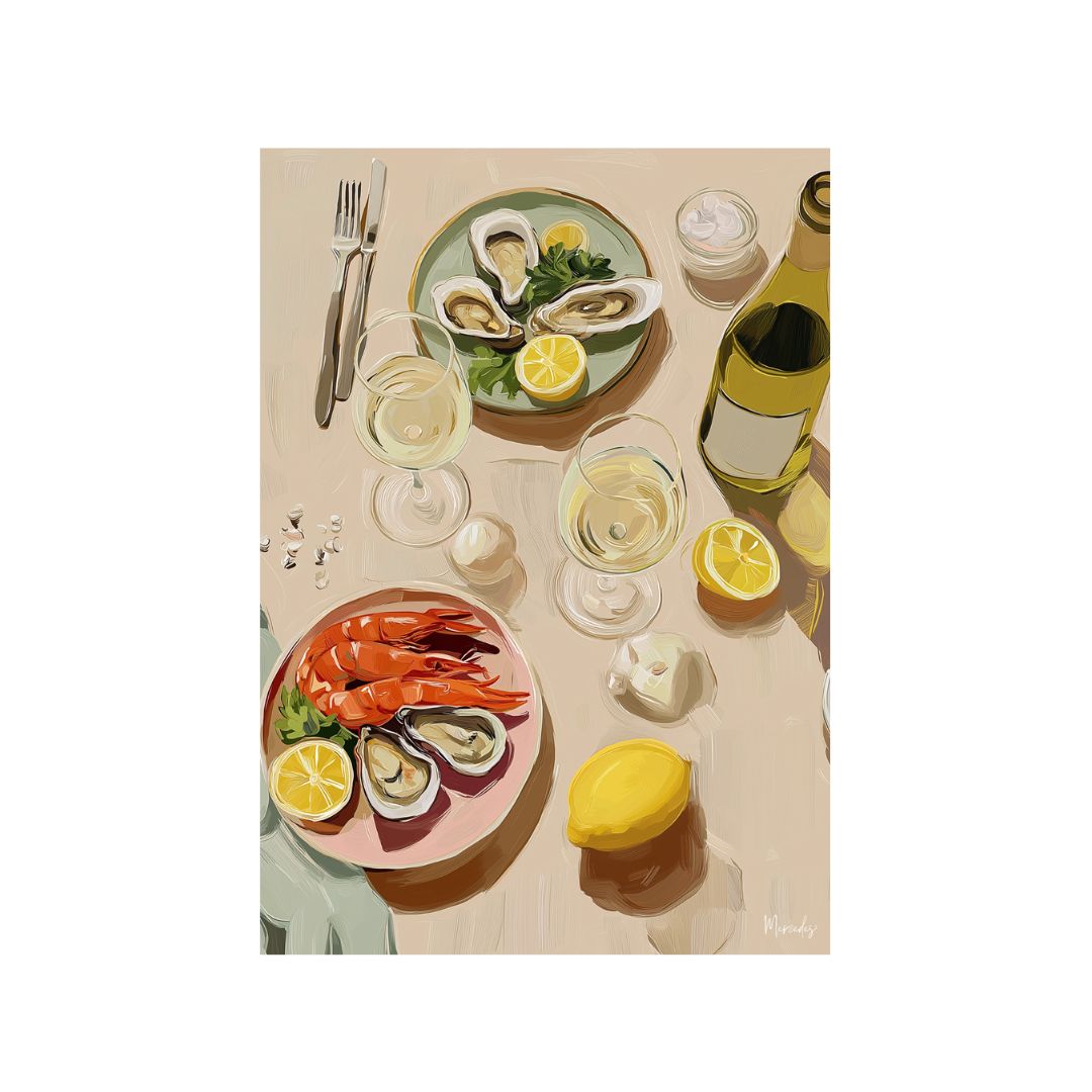 Celebrate coastal indulgence with Blanc De Blanc, a lively tribute to seafood feasts and sunlit gatherings. Fresh oysters, vibrant prawns, and crisp white wine come together in a scene that captures the joy of long lunches and effortless summer elegance. This artwork evokes the simple pleasure of good food, good company, and moments meant to be savoured.