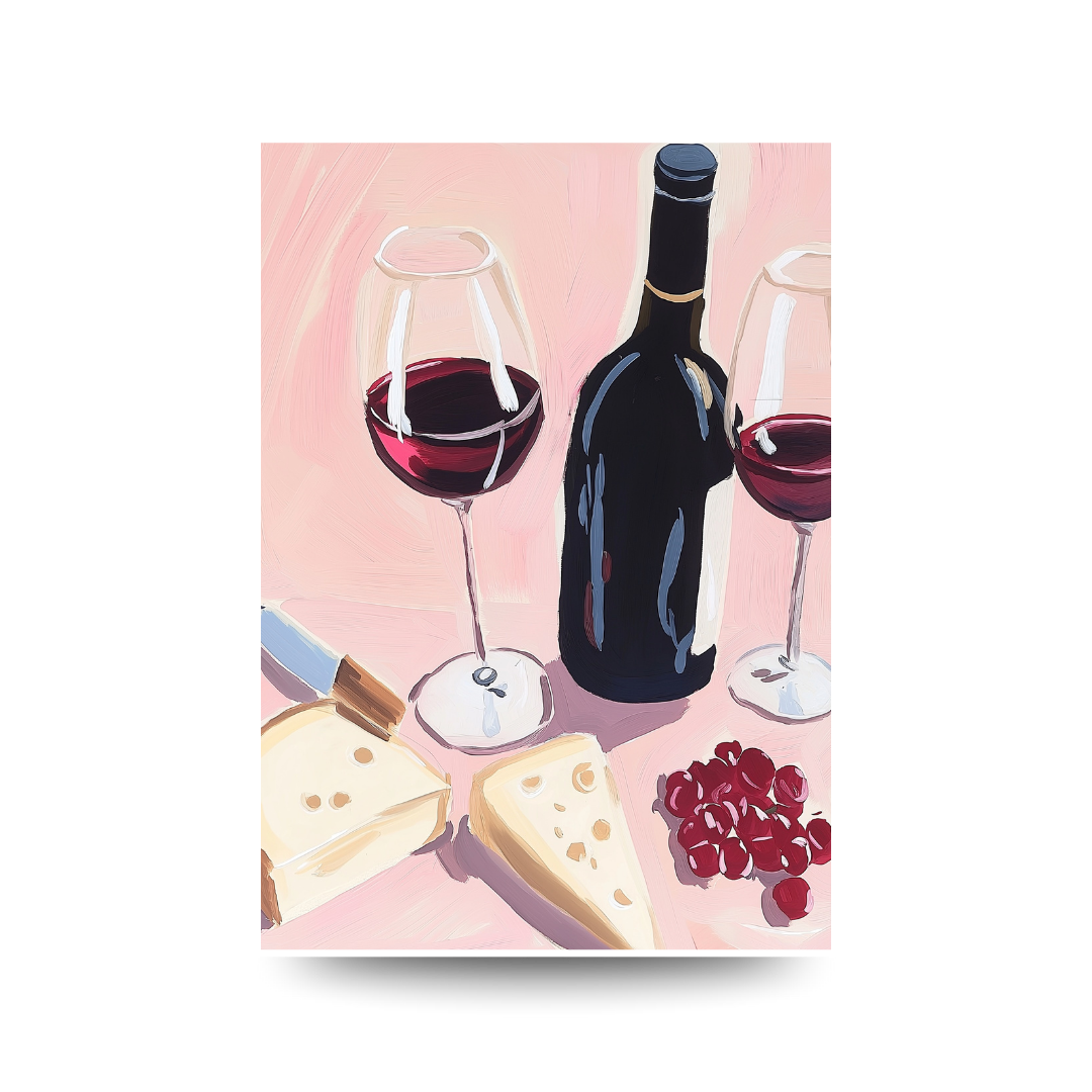 Unwind with the charm of ‘Lazy Pink Afternoons’, a stunning artwork that celebrates the simple pleasures of a slow, sunlit day. Featuring a bottle of rich red wine, two elegant glasses, and a beautifully arranged spread of creamy cheese and fresh grapes, this piece evokes the warmth and relaxation of an afternoon indulgence. Set against a soft pink backdrop, the composition exudes sophistication and a touch of nostalgia.