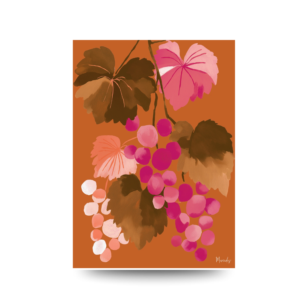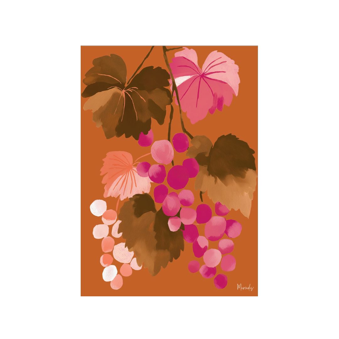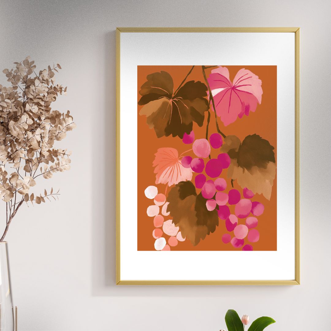 Celebrate the warmth of harvest with Sunset Grapes, a vibrant homage to the art of winemaking. Bathed in rich terracotta tones, clusters of pink and crimson grapes hang beneath autumn leaves, evoking the golden glow of dusk over vineyard rows. This artwork captures the timeless beauty of nature’s bounty and the artistry behind every vintage.